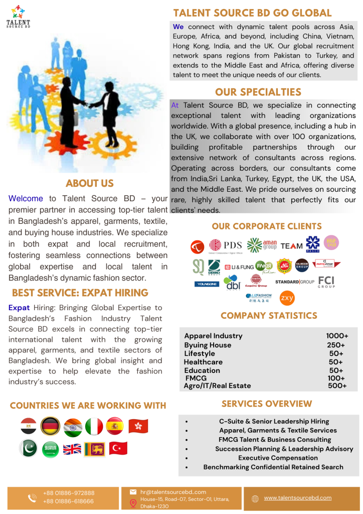 Talent Source BD is a leading recruitment firm/Executive Search that connects businesses with top talent nationally and Internationally. We specialize in sourcing candidates at all levels, from CxO to skilled and unskilled workers across different industries.